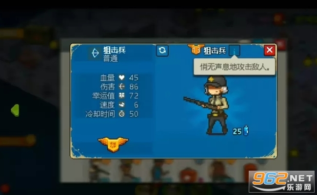 7、狙击兵。拥有最远的攻击距离和最高的攻击,但攻击间隔长且命中率较低。移动速度也比较慢。