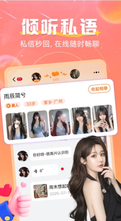 附近邻缘交友app是一款新兴的社交互动软件,未来还有很大的发展潜力,随着用户群体的不断扩大和功能的不断完善,附近邻缘有望成为年轻人社交和娱乐的重要平台,超多功能特别适合那些喜欢通过声音或画面表达自己的人,同时也为用户提供了更多互动的选择,体验全新的恋爱过程。