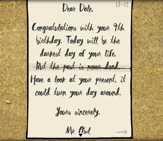 根据B娘2333提醒,另外Dale的生日也可以在《生日》中推导出来(或许这才是得知他生日的正确方式?),就在里面收到的那封信里右上角就写明Dale生日的日和月,而在信的内容提到这是他的9岁生日,《生日》发生的时间就是1939年,因此也可以得到Dale的生日的年份为1930年